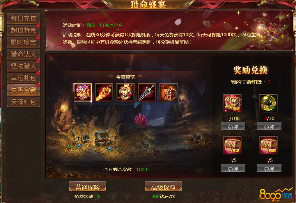 【说明】在线30分钟可获得1次探险机会,每天可免费获得10次。每天可探险500次,24点重置次数。探险过程中有机会额外获得宝藏钥匙,可兑换极品奖励!
