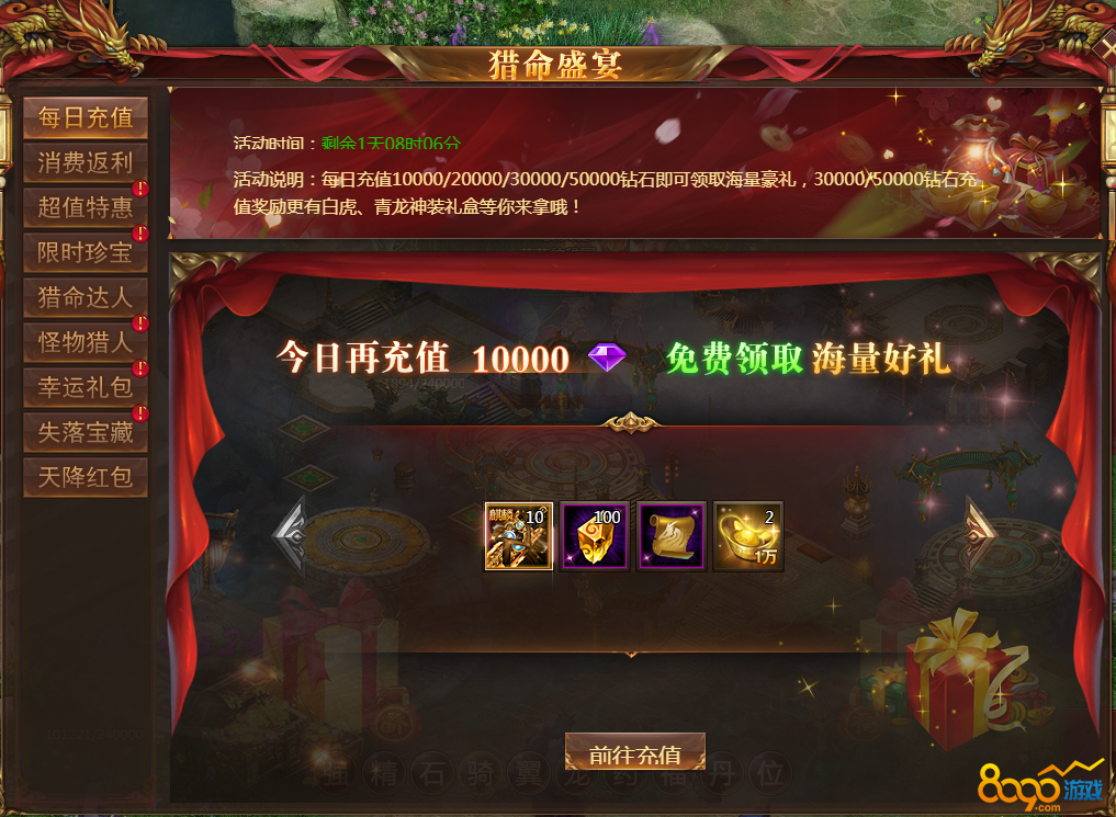 【说明】每日充值10000/20000/30000/50000钻石即可领取海量豪礼,30000/50000钻石充值奖励更有白虎、青龙神装礼盒等你来拿哦!