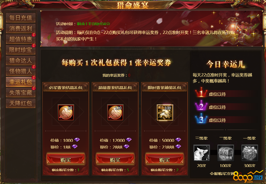 【说明】每天仅在0点~22点购买礼包可获得幸运奖券,22点准时开奖!三名幸运儿将在所有购买礼包的玩家中产生!