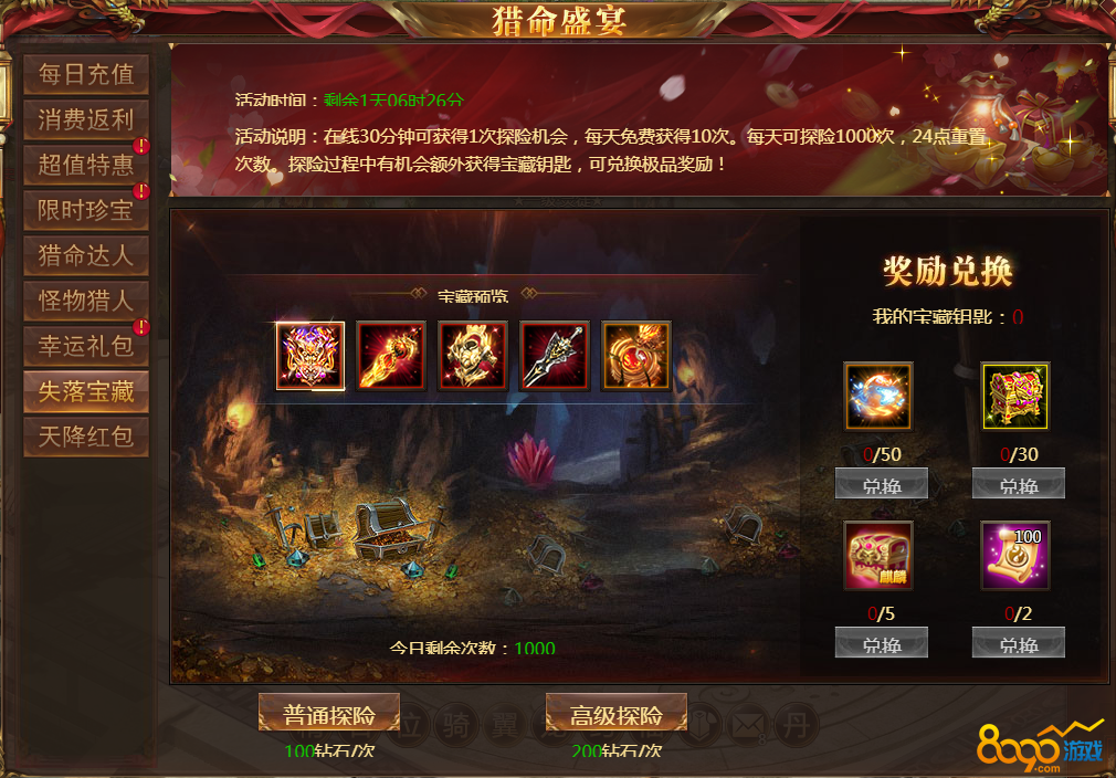 【说明】在线30分钟可获得1次探险机会,每天可免费获得10次。每天可探险1000次,24点重置次数。探险过程中有机会额外获得宝藏钥匙,可兑换极品奖励!