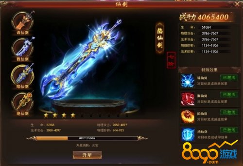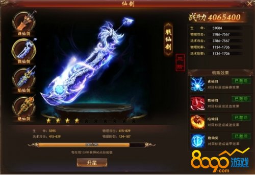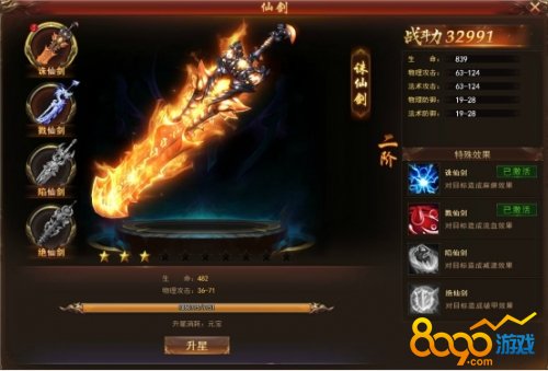 4、 每把仙剑都有特殊技能。诛仙剑→麻痹效果、戮仙剑→流血效果、陷仙剑→减速效果、绝仙剑→破甲效果