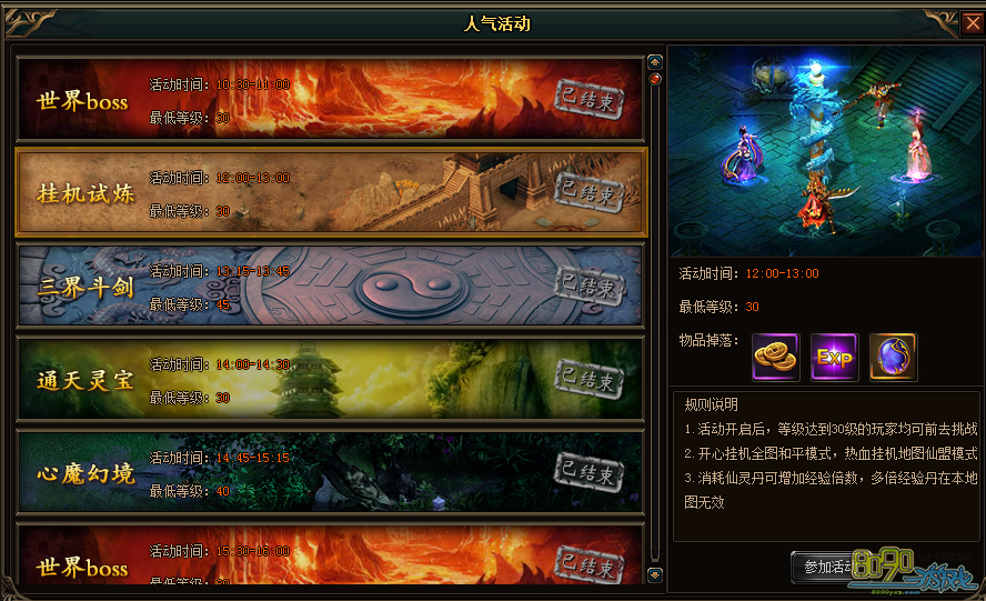 1.活动开启后,等级达到30级的玩家均可前去挑战