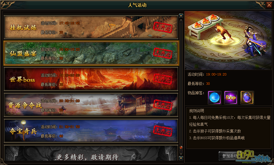 3.击杀boss可获得额外极品道具,所有在线的仙盟玩家都可获得一份