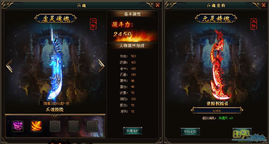 升级到不同等阶的兵魂会拥有不同的外观哦!当然在获得外观的同时,也有高额的战力加成,同时进阶兵魂到不同的等阶也会获得不同的兵魂技能哦!,拥有一把像样的兵魂和兵魂技能,往往在和对手的博弈中取得至关重要的决定因素!