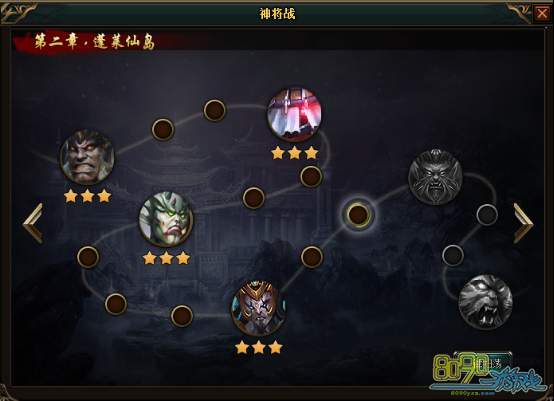 首先神将战是你的神将进行的闯关活动,所以玩家本身并没有多大的关系。你的神将够强才能闯的更远。在神将战中,依次点击图上的关卡进行闯关,每个关卡每天只能够闯一次,闯关成功后你将会获得经验、金钱、装备升级材料等物品。你闯关成功后的关卡第二天便可以使用右下角的一键扫荡系统,让你的闯关更加便利。