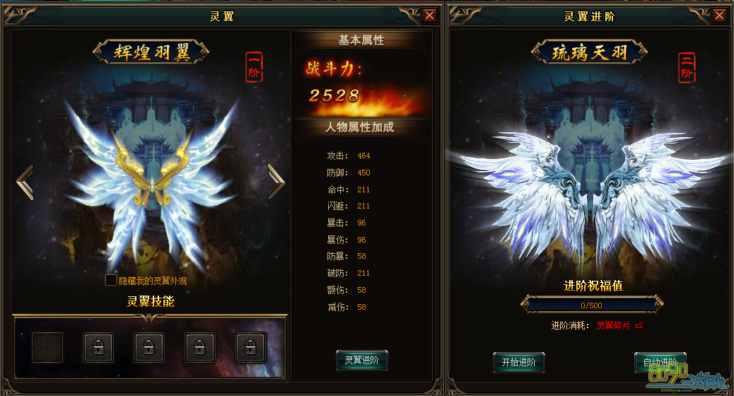 灵翼可通过进阶功能提升战斗力,每次进阶还能获得更美造型外观!