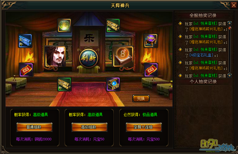 另外玩家收集到的神将碎片可以再兑换面边中进行兑换。10连抽必然可以获得更多的极品道具。