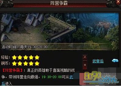 4.进入地图后只要不是相同阵营的全部都可以击杀,杀一个人是5分,助杀是2分,积分最高的军团就是阵营争霸的冠军,参加活动的人会获得经验和铜币的奖励。