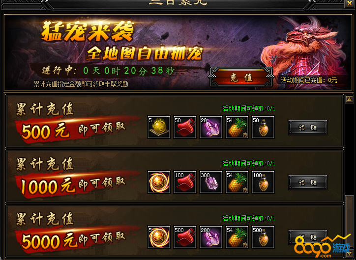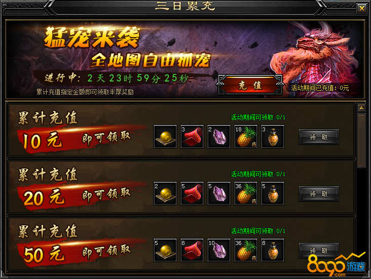 2.玩家三天活动内,累计充值达到一定额度,即可领取丰富奖励。
