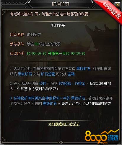 搜索"8090网页游戏"在8090丽华传奇中有一个道具是非常重要的那就是黑铁矿石,但是想要获得它就不得不参加矿洞争夺哦,最主要的原因就是获得的量会非常大呢,有需求的小伙伴们就跟着小编一起去看看吧!
