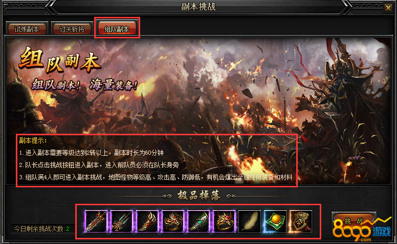 终于可以带着战友一起打副本了,组队副本需要2转以上玩家攻略,时间限制在60分钟。前提需要组队满4人才可进入,且队员要在队长附近。