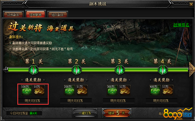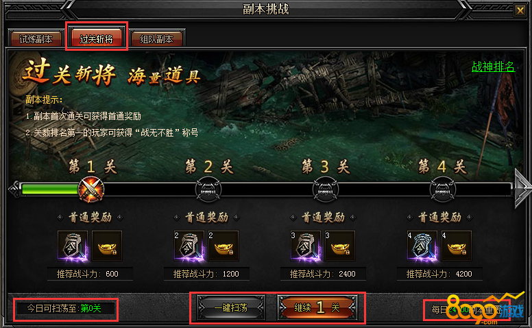 过关斩将不仅是验证实力的地方,还是获得无限奖励的好场所,记得每日来挑战,并取得好的成绩!