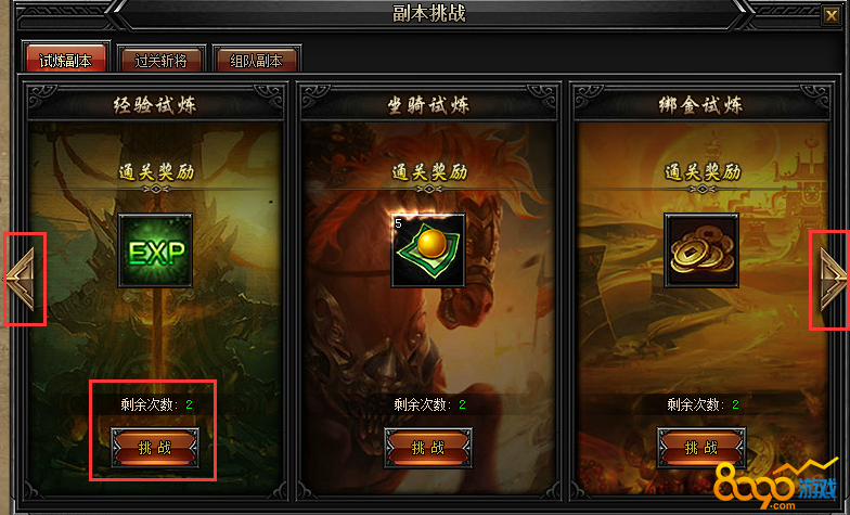 试炼副本有经验、坐骑、绑金等7种资源的副本,挑战成功后会获得大量资源和经验奖励,按左右三角号可切换,每种副本每天可挑战两次。