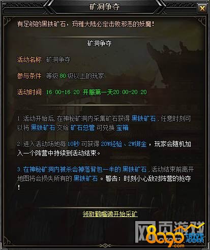 沙城城主为了对抗妖魔,筹建了大军。打造军队需要消耗大量黑铁矿石,城主征集玛雅大陆上各个势力的英雄来收集资源,并奖励给佼佼者神秘的宝箱。矿石是有限的,而人心的贪婪是无限的......在神秘矿洞里,天神和魔界阵营时刻发生着激烈的争夺!矿洞争夺为限时玩法,玩家在活动开放时,寻找到王城矿洞争夺NPC(99,152)即可进入活动。