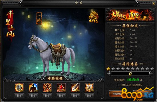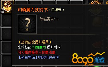 既然知道了对应界别开启的技能,接下来我们就来看看怎么激活这些技能把,需要什么道具:激活要对应的技能需要对应的坐骑技能书,比如说坐骑技能“幻骑魔力”升级需要幻骑魔力技能书,幻骑魔力技能可以大幅度提升任务魔法值。