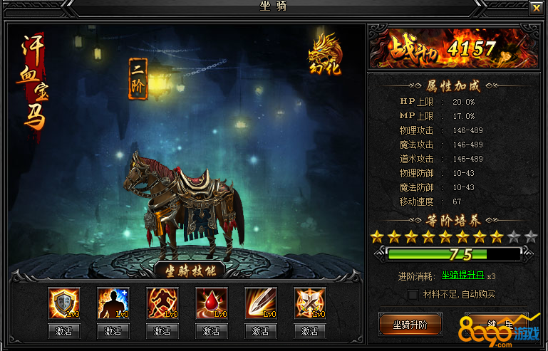游戏里坐骑的培养非常简单,游戏中获得的坐骑提升丹可以提升坐骑的星级,达到10星后就可以进阶为下一阶段坐骑。点击坐骑升阶按钮为消耗一颗丹药,提升10点培养度,点击一键一星按钮,如果丹药足够,可以提升坐骑一个星级。