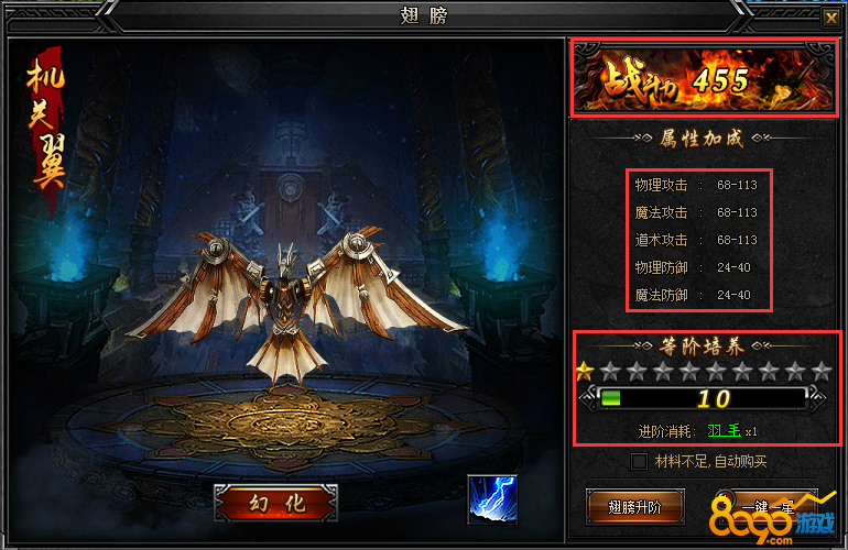 搜索"8090网页游戏"现在基本上所有的网页游戏都有翅膀系统,不仅可以为角色带来大量的属性提升,还可以让角色外观变的更加炫酷,那么下面小编就来介绍一下丽华传奇中的翅膀的作用和升级方法。