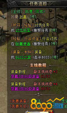 在游戏前期,玩家应该注意游戏右侧的任务追踪,查看主线任务,前期主线任务是非常重要的,一定要跟着主线任务走,完成主线任务可以获得大量经验和装备。主线任务做完以后可以做一些经验任务,经验任务有讨伐将军,除魔使者,押镖美女,石墓烧猪,还有一个日常的收集粮食的任务,完成这些任务都可以迅速的升级。