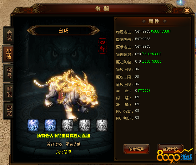 首先,不同的坐骑会有不同的属性,而升级坐骑会有两个方面,一个是骑术精通,还有一个是坐骑进阶,升级骑术,增加的是固定的人物属性,这个和坐骑不同没有关系,计算没有坐骑,骑术增加的属性也还是在的,也就说战力还在,但升阶坐骑也会提升坐骑带来的属性,这个属性,不同的坐骑带来的二属性是不同的,所以这部分属性,在坐骑时间到了时候,就会一同消失了,不过游戏中商城会卖一些坐骑,而且有一些活动也会出现永久坐骑噢,就看各位小伙伴是不是细心参加到活动了噢。