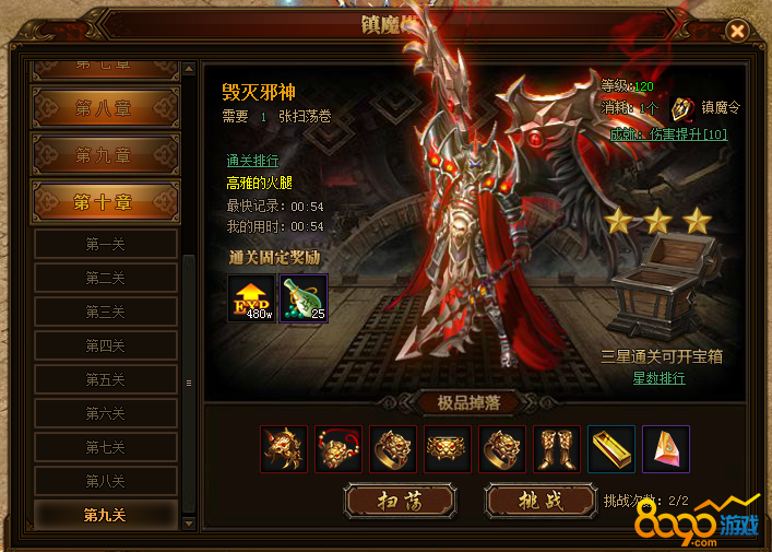 首先,进入镇魔塔是需要镇魔令的,镇魔塔一共分为十章,每一章有九关,越往上,难度越高,除了会出一些战神的材料之外,还会开启成就系统,成就会增加玩家的攻击力,血量,获取经验的速度等等好处,而且越快完成镇魔塔,还会有排名噢,有一个专门针对镇魔塔的排行榜,镇魔塔的BOSS也是会出装备的,最高可以获得13阶的装备,当然,镇魔塔全部通过之后,玩家也是还是可以继续打的,成就奖励只能领取一次,但是击杀BOSS的奖励每次击杀都可以领取。