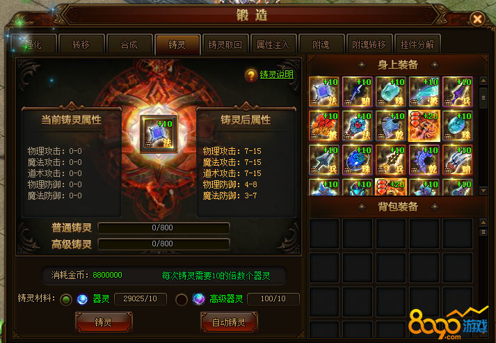 装备注灵需要消耗器灵,普通器灵和高级器灵,普通器灵注灵满属性是消耗800个,高级器灵也同样需要800个,除了需要消耗器灵之外,还需要消耗海量的金币,这个越都后面,需要的金币越多,大家在注灵的时候,一定要注意金币的消耗情况,避免一下子把金币用光的情况出现。