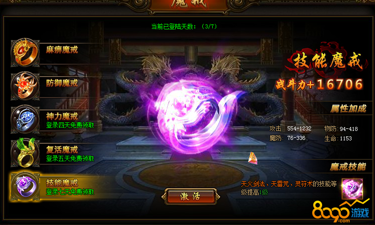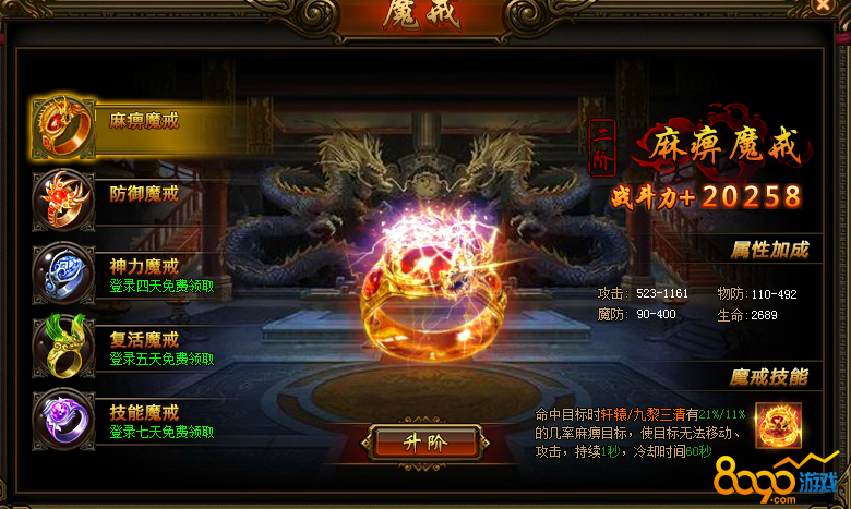 神力魔戒:攻击时有几率提升自己百分之十的攻击。