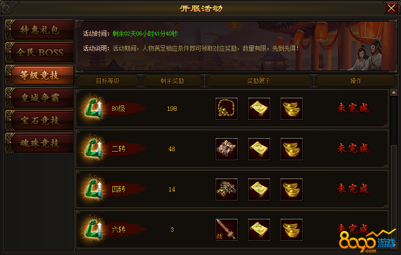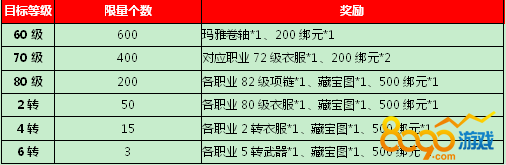 活动介绍:活动期间达到指定的等级,即可领取海量元宝和稀有道具奖励,数量有限,先到先得。