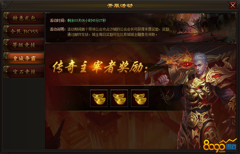 活动介绍:开服第5天首次开启皇城争霸,胜利的公会会长,可领取20000元宝奖励。