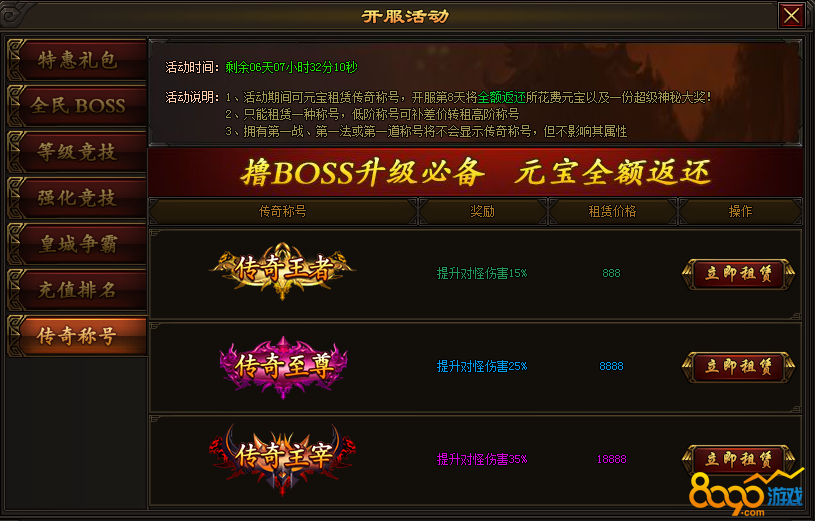 活动内容:活动期间,购买传奇称号,可获得限时称号,提升对怪物的伤害加成,开服第八天全额返还所花费元宝,并额外奖励一个神秘大奖!