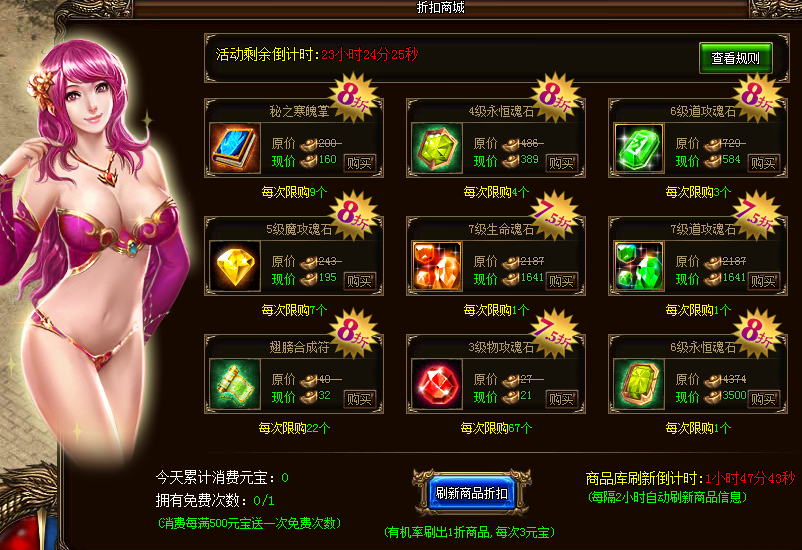 活动详情:活动期间,折扣商城珍宝每2小时刷新一次,低折大放送,最低可1折购买。每天拥有免费刷新折扣次数1次,每消费满500元宝亦可获得一次免费刷新机会,可不断叠加。