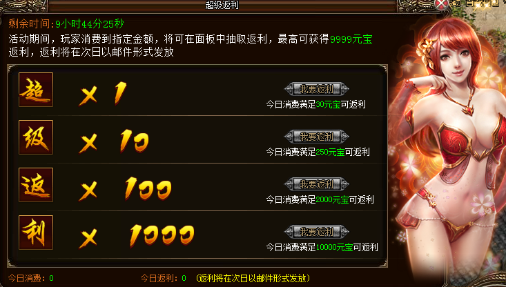 活动详情:活动期间,玩家消费到指定金额,即可在面板中抽取返利,最高可获得9999元宝返利。返利将在次日以邮件形式发放。