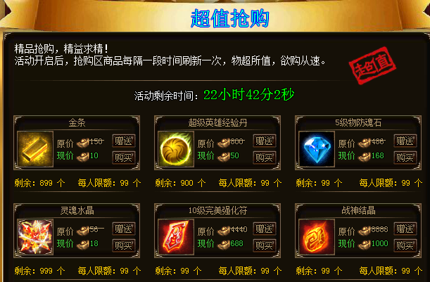 活动详情:活动开启后,抢购区商品每隔一段时间刷新一次,玩家可通过超低的价格抢购各种稀有道具,限量发售,物超所值,欲购从速!