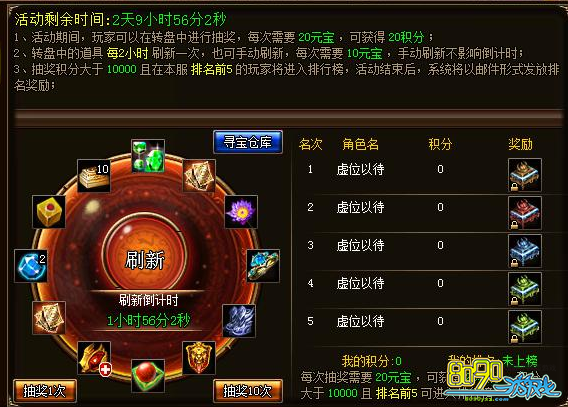 活动规则:活动开启后,转盘中的奖励每2小时自动刷新一次,玩家可花费元宝立即刷新;活动期间,玩家可以在活动面板中进行抽奖,每次抽奖需要20元宝,可获得20积分,抽奖获得的物品将进入寻宝仓库;累计积分大于10000且本服排名前5位的玩家,可在活动结束后获得积分排名奖励,奖励以邮件形式发放。