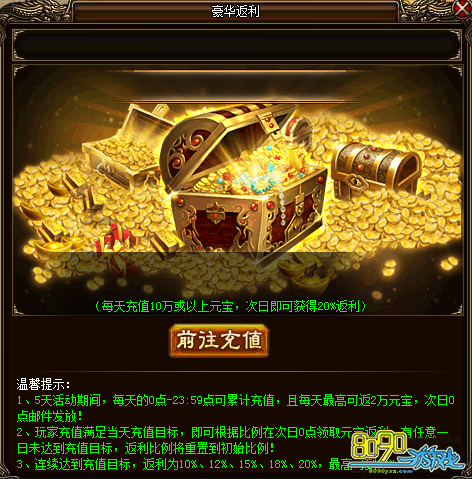 活动详情:活动期间,每天0:00-23:59可累计充值,且每天最高可返2万元宝,次日0点邮件发放。玩家充值满足当天充值目标,即可根据比例在次日0点领取元宝返利,有任意一日未达到充值目标,返利比例将重置到初始比例。连续达到充值目标,返利为10%、12%、15%、18%、20%,最高可到20%。