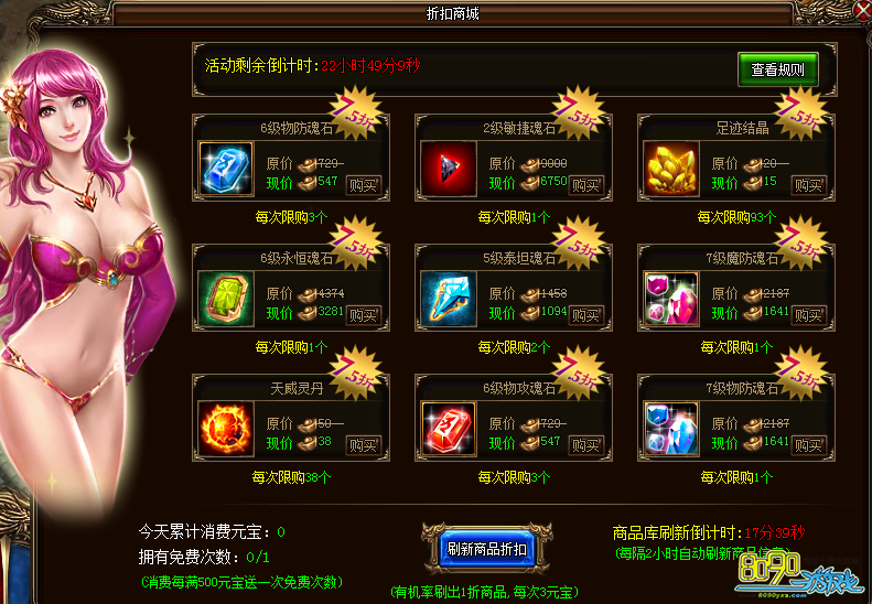 活动详情:活动期间,折扣商城珍宝每2小时刷新一次,低折大放送,最低可1折购买。每天拥有免费刷新折扣次数1次,每消费满500元宝亦可获得一次免费刷新机会,可不断叠加。