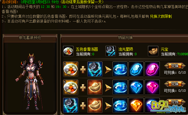 1)美味汤圆:活动期间,每天12:30及19:30会在土城随机5个坐标点刷出一波咕噜怪物,击杀有几率掉落五色香滑汤圆等道具,收集对应数量的汤圆可在面板上兑换各种元宵礼包,礼包含有最新套装的升级材料。除击杀咕噜外,汤圆还能通过参加元宵抽奖及佳节赏灯活动获得。