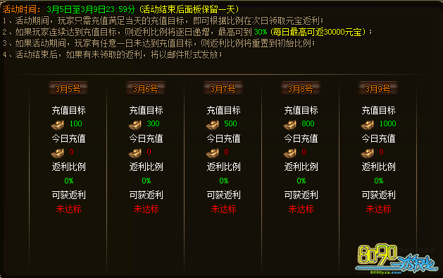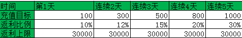 2)充值返利:活动期间,玩家每天只要提取元宝满足当天的充值目标即可根据相应的比例在次日领取元宝返利,如玩家连续达到充值目标则返利比例逐日递增,最高可到30%,但中途一天没有达到目标则返利比例重置到初始比例,且每日元宝返利有30000的最高限制。
