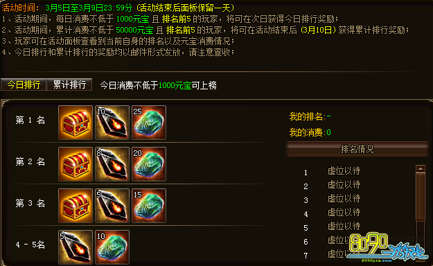 3)消费排行:活动期间,玩家每日消费不低于1000元宝且在每日消费排行榜前5的玩家,将在次日获得今日排行奖励,每日消费排行每天零点重置,而活动期间消费不低于50000元宝且累计消费排行榜前5的玩家将在活动结束后获得累计消费排行奖励。