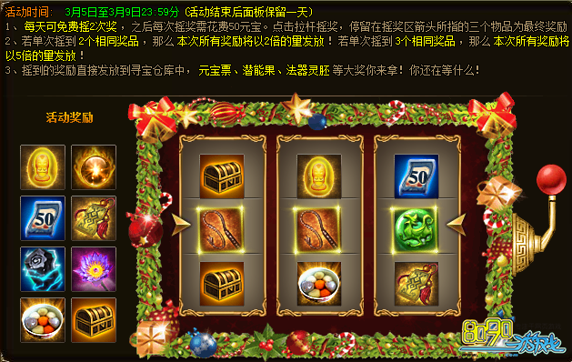 4)元宵抽奖:活动期间,玩家可在活动界面点击拉杆摇奖,停留在奖区箭头所指的三个物品为奖励,奖励直接发放到寻宝仓库中,若单次摇到2个相同物品,则本次所有奖励都以2倍的数量发放,若单次摇到3个相同物品则本例所有奖励将以5倍的数量发放。