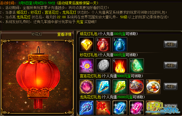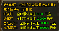 5)全民赏灯:活动期间,按全服玩家累计充值数量点亮相应的花灯,激活相应的花灯以及个人提取元宝满足要求时即可领取相应的花灯礼包。当点亮龙凤花灯后,每天22:00系统将会在世界范围向50级以上在线玩家发放大量礼券,同时还有几率抽取部分玩家发放元宝奖励。