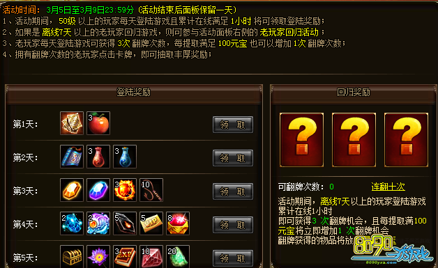 6)佳节豪礼:活动期间,50级以上玩家每天累计在线满足1小时即可领取登陆奖励。同时离线7天以上的老玩家回归游戏,则可参与右侧的老玩家回归翻牌活动,老玩家每天登陆游戏即可获得3次翻牌次数,且每累计提取100元宝即增加一次翻牌次数,翻牌次数累计不重置,翻牌获得的物品发放到寻宝仓库。