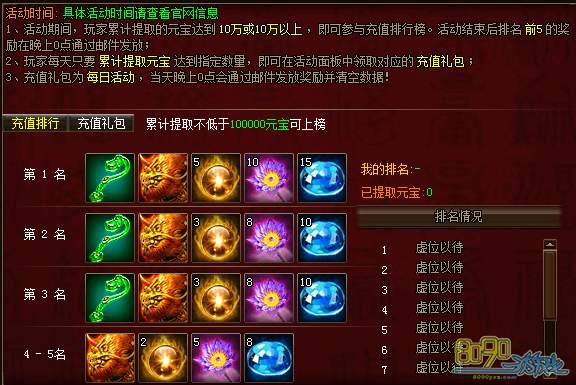 活动期间,玩家每天提取元宝达到188、688、1888、2888、3888时即可领取每日充值礼包。活动期间,玩家累计提取元宝达10万以上可参与充值排行,活动结束时排行前5的玩家可获得奖励,奖励在活动结束时以邮件形式发放。