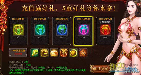 活动详情:活动期间充值达到指定元宝数,即可领取一份对应充值礼包,3000元宝礼包更可重复充值领取10次,每充值3000元宝可领取一个,直到礼包数为0为止。