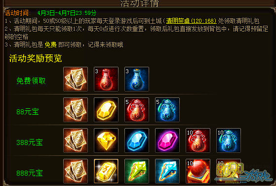 活动期间,50级及以上的玩家每天可到土城清明祭桌处免费领取一个清明礼盒,清明礼盒可以免费打开,也可以分别消耗88、388、888元宝打开,消耗元宝档次越高获得的奖励越丰富。