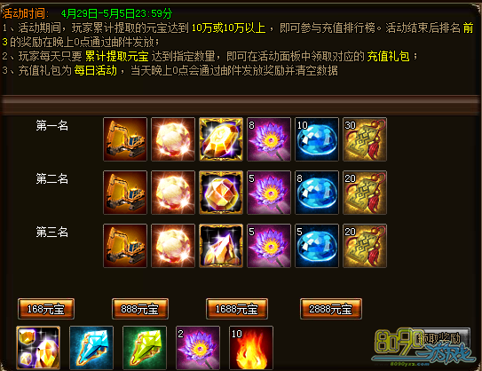 活动期间,玩家每天只要累积提取元宝达到指定数量即可在活动面板领取对应的充值礼包。玩家累计提取元宝达到10万或以上即可参与充值排行榜,活动结束时充值排行前三名玩家可获得丰富奖励。