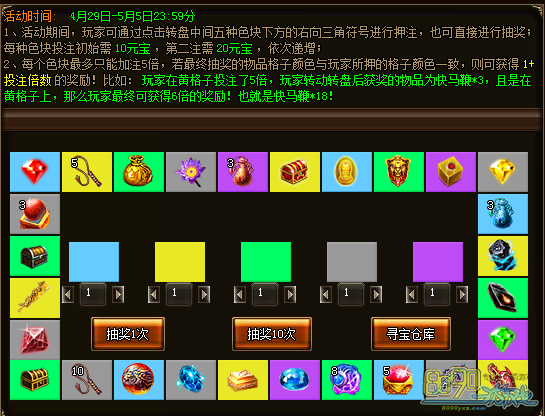 c)若抽奖获得的物品格子颜色与所押注的格子颜色一致,则可获得1+投注倍数的物品奖励,例如玩家押5注黄色格子点击抽奖后抽中黄色格子的快马鞭*5,则最终可获得6倍奖励,即30个快马鞭。