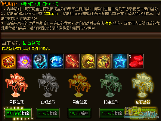 b) 初始抽奖为黄铜盆栽,黄铜盆栽摘除需消耗20万金币,其他都需要元宝才能摘除,摘取抽奖后有几率激活高一级的盆栽,如此类推,盆栽等级越高奖励越丰富。