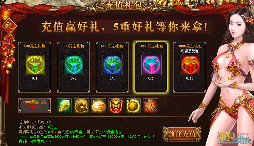 活动详情:活动期间充值达到指定元宝数,即可领取一份对应充值礼包,3000元宝礼包更可重复充值领取10次,每充值3000元宝可领取一个,直到礼包数为0为止。