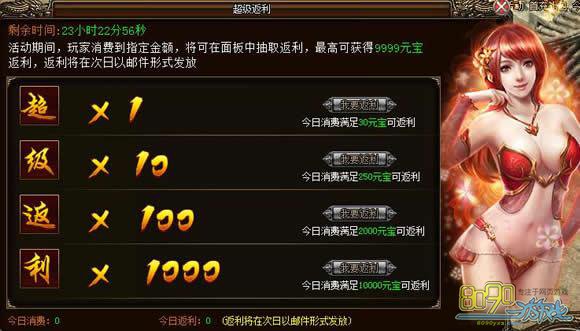 活动详情:活动期间,玩家消费到指定金额,即可在面板中抽取返利,最高可获得9999元宝返利。返利将在次日以邮件形式发放。