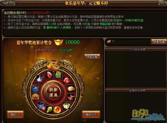 1、嘉年华转盘每次抽奖需花费20元宝,每抽1次累计奖池增加10元宝,奖池设有3项元宝大奖,分为惊喜大奖、豪华大奖、至尊大奖,奖励最高可获得5%、15%、30%的奖池元宝。抽中元宝需缴纳5%个人所得税。